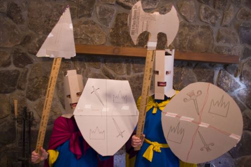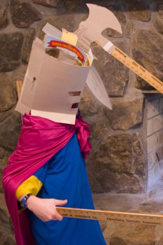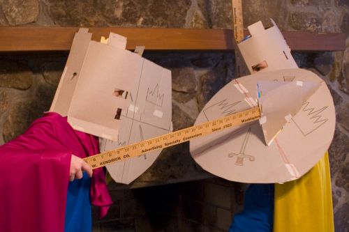 Today David and I decided that it would be really exciting to dress up like knights. So we got a lot of cardboard and made helmets, shields, a battleaxe and a spear. Then we went downstairs and pretended to fight a great big battle! In the fighting that ensued, David got wounded but I came and rescued him right before the bad guys took the city. Then David and I assembled a huge army and recaptured it for ever. Creativity sure is better than being a couch potato!