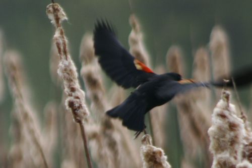 Red-winged Blackbird in flightIt was the perfect morning for birdwatching! The sun was just coming up when we arrived and the birds were already active. Slowly and quietly we hiked through wood and marsh on trail and boardwalk, stopping to examine everything with binocular and camera.