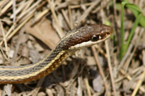 {huntly} Close up of the Ribbon SnakeAs it turned out, it was a good reptile-watching day too. At noon, the sun came out from behind the clouds and all kinds of critters came out to warm up. We saw many frogs, toads and turtles which were relatively common but still exciting to see. Then, to top off an already-successful day, we found a beautiful Eastern Ribbon Snake which many of us had never seen before.