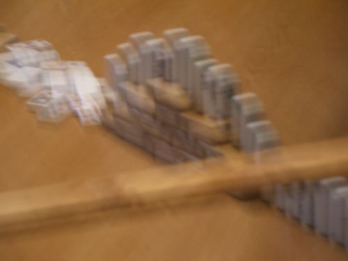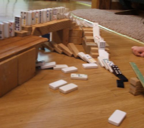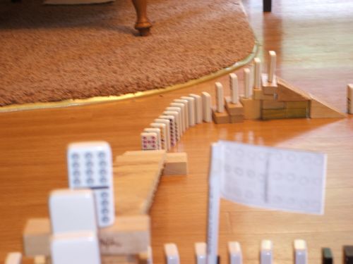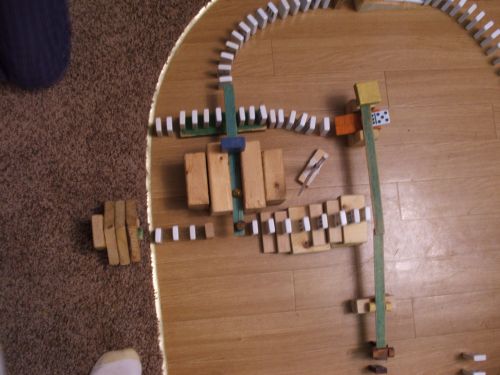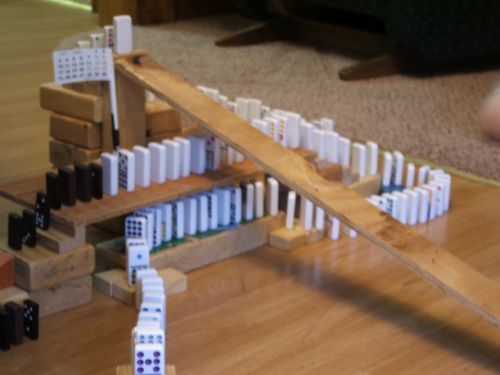 experimenting with this recently. What tremendous fun it was to set up tracks for the dominoes! They slid down ramps, fell over, through, and under bridges and tunnels, and traveled through many incredible patterns! I especially liked using stairs, slides, block piles and the dinner bell! One even used Lincoln Logs and a marble. In picture number 6 you can see the long green piece that has a Lincoln Log balanced on its end. When the domino behind the blocks (you can see it in picture 5) ![]()