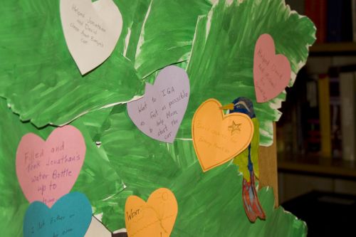 This month our family has been studying the character quality of “love” (Giving to others’ basic needs without having as my motive personal reward). To help us learn this quality we made a “love tree.” Here’s how it works: each person gets a different colored heart. Every time someone does a good deed” they write it down on their color heart and tape it to the tree. Here are specific things that members of the family shared with me about how the love tree changed the way they think of doing good for others during this mornings Flash News Interviews. The question is: how has the love tree changed the way you think of doing good for others?