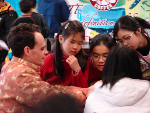 No, I’m afraid I’ll have to see that one one more time before I can do it. This card trick was simply the “Pick a card, put it on top, shuffle them up … Is that your card?” trick 😉 And by the way, the Taiwanese jacket in that picture was a special New Year’s gift from Mr. Sun and is one of the warmest I’ve ever worn–They say the silk retains heat really well but can still “breathe” in the summertime.