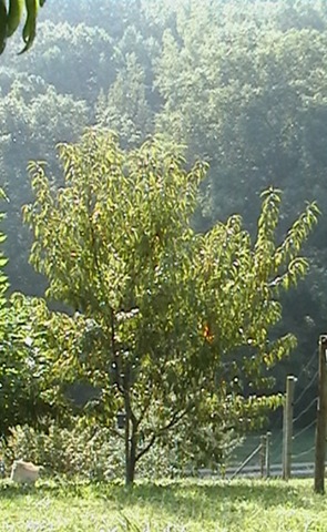 aggressively devoured over-ripe fruits. Borer (Synanthedon exitosa) damage has also been insignificant, and lesser borers (S. pictipes) have not shown up. I have noticed that one tree with some wild mint growing around its base was the only tree to be completely free of borers this year, and I think I’ll try planting oregano around the other trees. Fertilization has been accomplished by amending the soil before planting and using natural mulches and amendments such as composted leaves from the forest, manure, gypsum, rock phosphate, wood ashes, and agricultural lime. Applications have been the same for all the trees planted in the same year as well as fruit thinning and pruning practices.