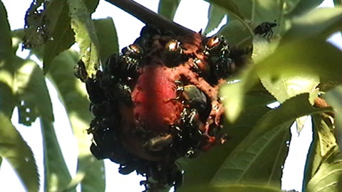 None of the trees have received any spray treatments [such as for pests or diseases]. The Japanese beetles tend to favor the apples and plums and have not caused significant trouble with the peaches, although they
