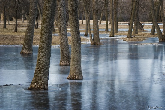 Have you ever seen trees standing in frozen flood-water? It’s peculiarity was one reason I decided to take this picture that cold, Friday evening after work last month. The light was fading, so I quickly set up the tripod and camera close to the waters edge. Heavy snowfall was in the forecast for that very night and the warmth of spring would come soon after that; I knew this might be the last chance I had to capture this strange occurrence.