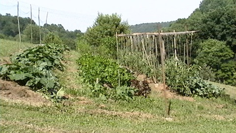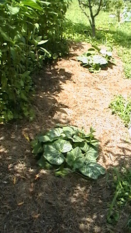 Neck pumpkins on July 18 '08 nearly fill the new bed on the left, but their spreading has just begun.Our new garden area was on a sloping hill with healthy sod on top of fertile but shallow soil (about 8 inches deep) above a base of clay. It was a 65 foot row being added to the uphill side of our existing garden.