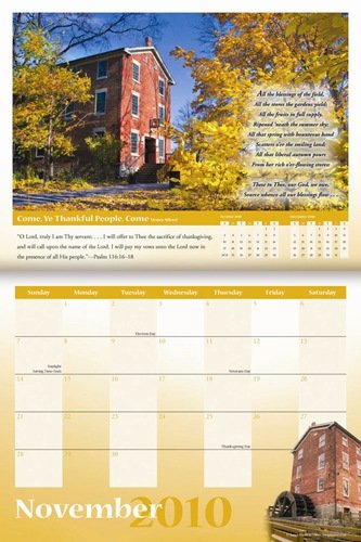 It’s neat to see God’s hand at work in making this production possible! Two years ago, I ordered a small, $24 calendar to give to my Mom for Christmas; people liked it, so I went a step farther the next year by putting together a custom design and printing it myself here at IBLP Headquarters. I got rid of them so fast last year that I decided to put a bit more time and effort into one this year. The result was a complete re-design printed on a Heidelberg 10-Color press, an upgrade that places the product in the professional side of the spectrum.