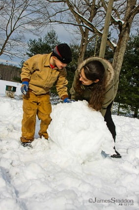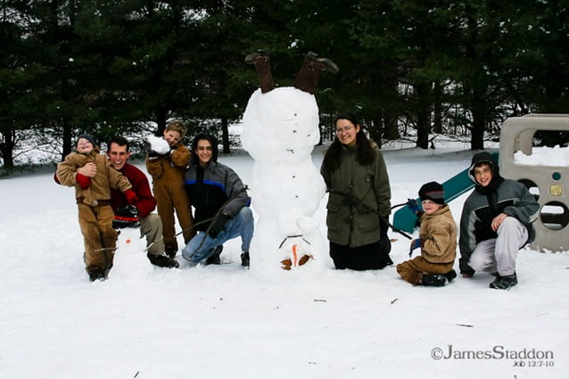 Safe and sound at the Altizer's house The huge snow storm turned our original 6-hour trip to North Carolina into an exhausting 20 hours on the road. What a joy and refreshment it was to finally reach our destination, the Altizers! It was 10:00 in the morning and Karen had a feast prepared for us, which energized us for an exciting snowball fight. Their boys, Joshua, Caleb, Jonathan, and David had lots of creative ideas for a snowman: upside down with two noses, a tail, and a bow tie! 🙂